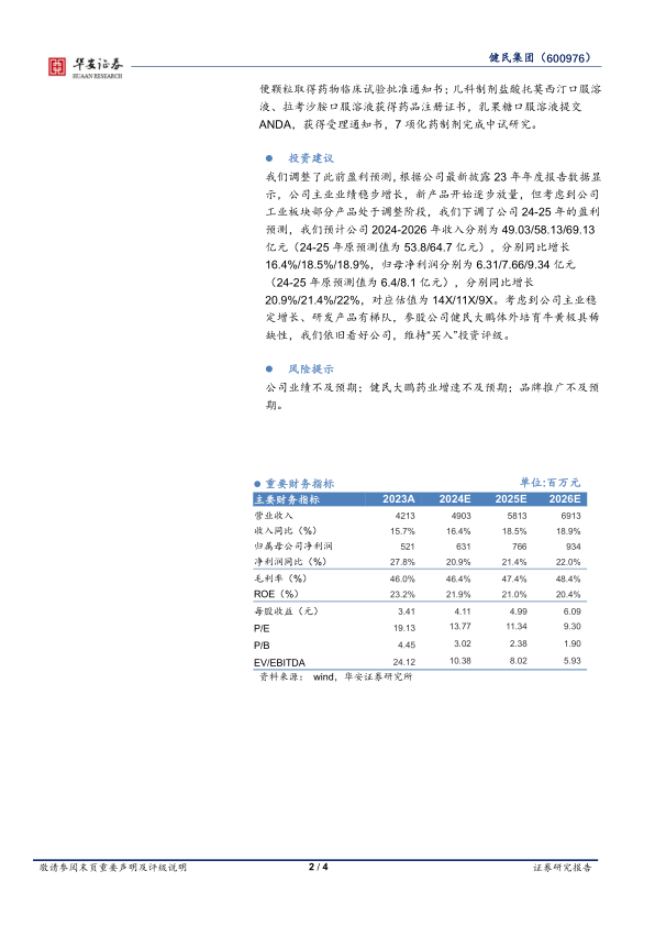 20.9%/21.4%/22%,对应估值为14X/11X/9X。考虑到公司主业稳定增长、研发产品有梯队,参股公司健民大鹏体外培育牛黄极具稀缺性,我们依旧看好公司,维持“买入”投资评级。