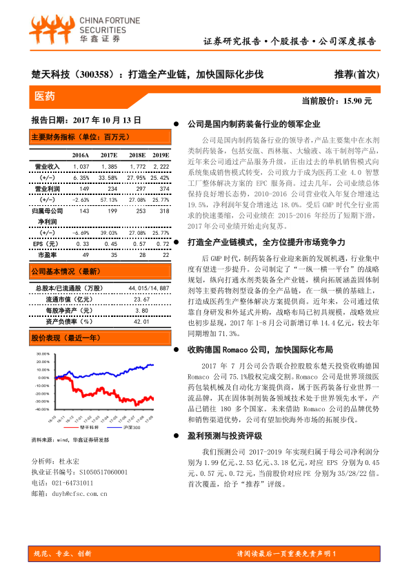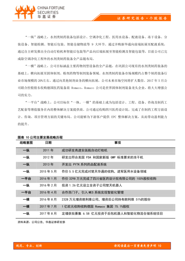 本报告分析了楚天科技作为国内制药装备行业领军企业的优势和发展战略。公司通过“一纵一横一平台”战略,积极拓展全产业链布局,并通过收购德国Romaco公司加速国际化进程。在后GMP时代,制药装备行业迎来新的发展机遇,楚天科技有望凭借其技术优势和战略布局,实现业绩持续增长。
