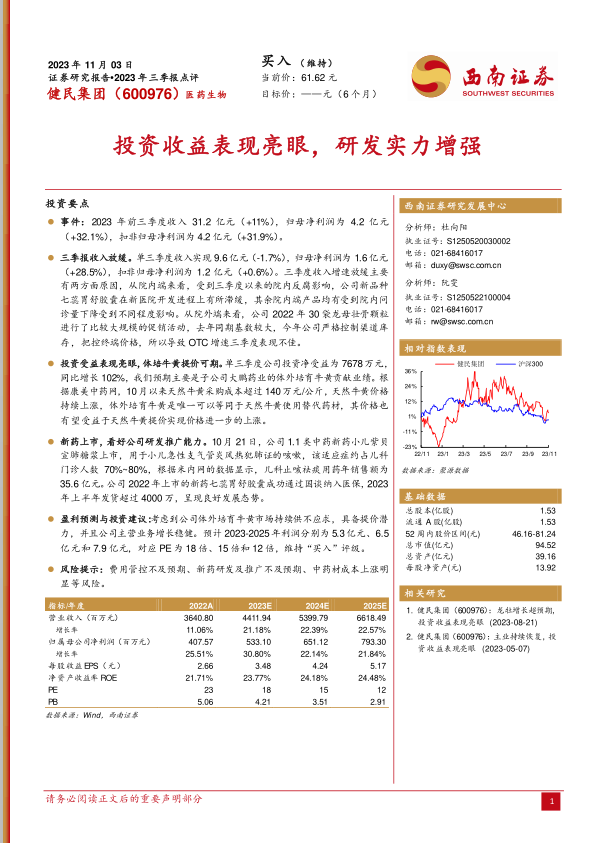本报告对健民集团2023年三季报进行了深入分析。公司前三季度业绩表现亮眼,投资收益大幅增长,新药上市也增强了研发实力。但三季度收入增速放缓,主要受院内反腐和院外促销活动影响。考虑到体外培育牛黄市场供不应求,具备提价潜力,且主营业务稳健增长,维持“买入”评级。同时,报告也提示了费用管控、新药研发推广以及中药材成本上涨等风险。
