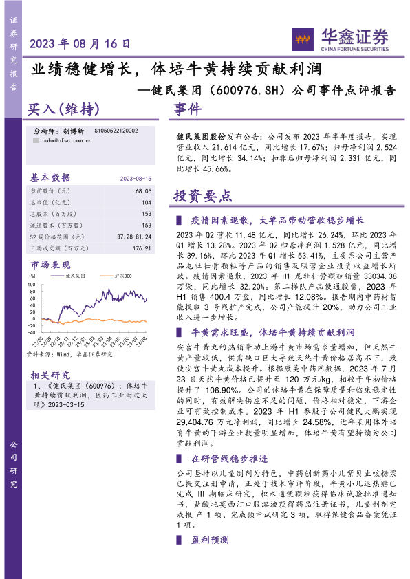 本报告分析了健民集团2023年半年度报告,指出公司在疫情影响消退后,凭借核心产品龙牡壮骨颗粒的销量增长和体培牛黄的持续贡献,实现了营收和利润的稳健增长。同时,公司在研管线稳步推进,未来发展潜力巨大。报告维持“买入”投资评级,并提示了相关风险。