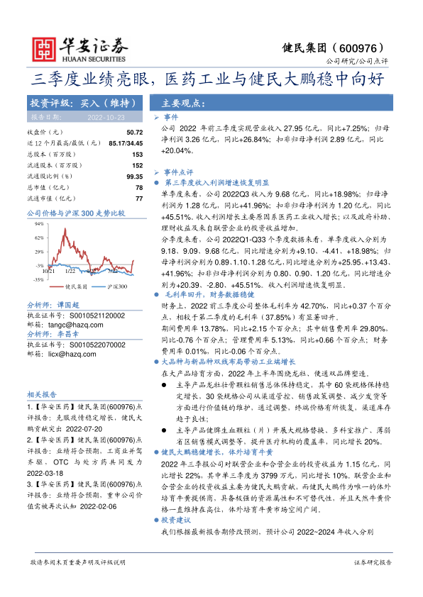 本报告分析了健民集团2022年前三季度的业绩表现,并维持“买入”投资评级。核心观点如下: