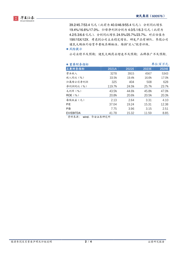 我们根据最新报告期修改预测, 预计公司 2022~2024 年收入分别39.2/45.7/53.4 亿元(此前为 40.0/46.9/55.4 亿元),分别同比增长19.4%/16.6%/17.0%,归母净利润分别为 4.0/5.1/6.3 亿元(此前为4.2/5.3/6.6 亿元),分别同比增长 24.5%/25.7%/23.7%,对应估值为19X/15X/12X。 考虑到公司主业稳定增长、研发产品有梯队,参股公司健民大鹏体外培育牛黄极具稀缺性,维持“买入”投资评级。