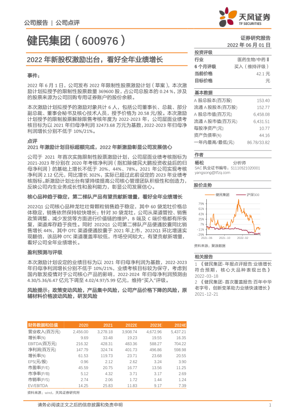 本报告分析了健民集团的最新股权激励计划和业务发展情况。公司通过股权激励计划提振管理层信心,核心产品销售稳健,二线产品增长潜力大。虽然考虑到疫情影响下调了盈利预测,但维持“买入”评级。投资者应关注政策变动、产品集中等风险。