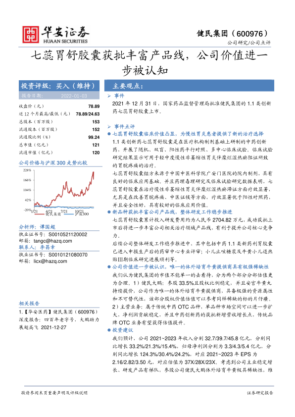 2021年12月31日,国家药品监督管理局批准健民集团的1.1类创新药七蕊胃舒胶囊上市。