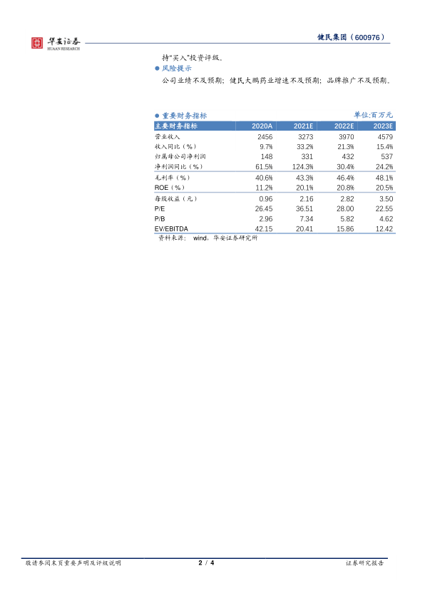 我们预计,公司2021~2023年收入分别32.7/39.7/45.8亿元,分别同比增长33.2%/21.3%/15.4%,归母净利润分别为3.3/4.3/5.4亿元,分别同比增长124.3%/30.4%/24.2%,对应2021~2023年EPS为2.16/2.82/3.50元,对应估值为37X/28X/23X。考虑到公司主业稳定增长、研发产品有梯队,参股公司健民大鹏体外培育牛黄极具稀缺性,维持“买入”投资评级。