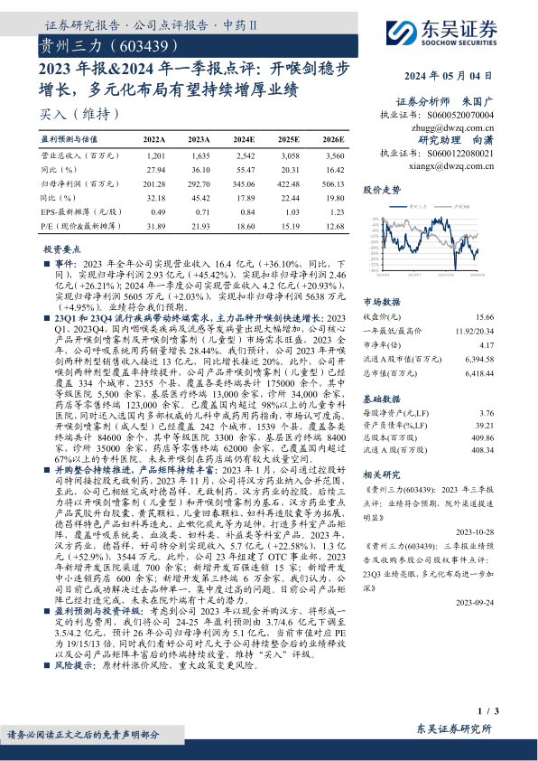 贵州三力2023年报和2024年一季报显示,公司核心产品开喉剑系列受益于市场需求增长,销售额稳步提升。同时,公司通过并购整合,不断丰富产品矩阵,向呼吸系统、血液、妇科、补益等多科室拓展,有望持续增厚业绩。