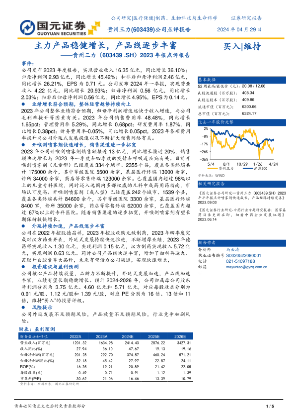 贵州三力在2023年及2024年一季度表现出强劲的业绩增长,核心产品“开喉剑喷雾剂”系列通过广泛的渠道覆盖实现了快速放量。公司通过积极的外延并购策略,成功丰富了产品线,并有效增厚了业绩。尽管面临外延发展、产品放量和行业竞争等风险,但公司凭借其核心产品的市场优势和多元化的产品布局,预计未来将保持稳健的增长态势,维持“买入”的投资评级。