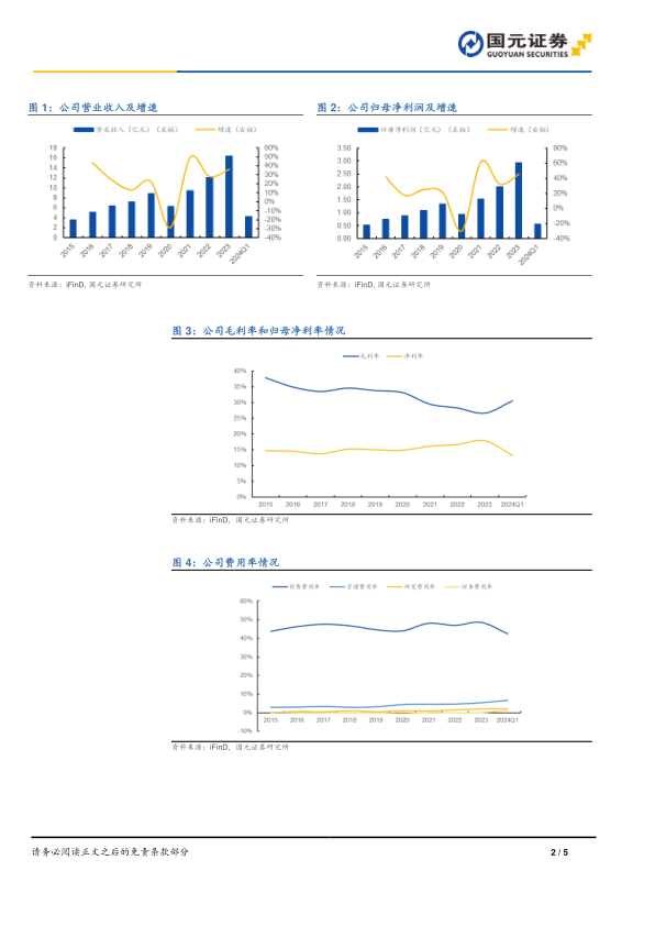 公司发布2023年度报告,实现营业收入16.35亿元,同比增长36.10%;归母净利润2.93亿元,同比增长45.42%;扣非后归母净利润2.46亿元,同比增长26.21%,EPS为0.71元。公司发布2024年一季报,实现营业收入4.22亿元,同比增长20.93%;归母净利润0.56亿元,同比增长2.03%;扣非后归母净利润0.56亿元,同比增长4.95%,EPS为0.14元。
