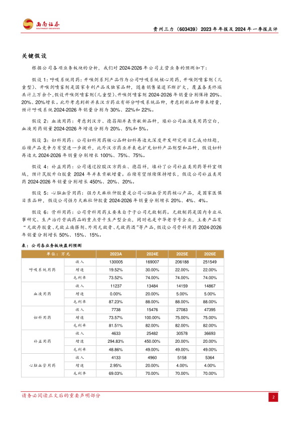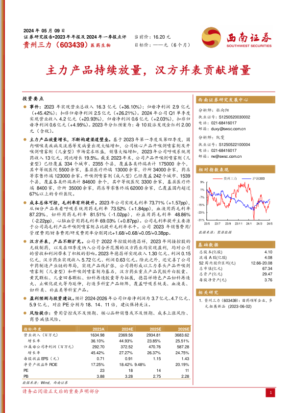 汉方并表,产品不断扩充。公司于2022年控股的德昌祥,2023年间接控股的无敌制药,以及在四季度纳入公司合并范围的汉方药业均实现盈利,均对公司的营收和利润带来了积极的影响。2023年德昌祥实现收入1.30亿元、利润0.15亿元,汉方药业实现收入5.72亿元、利润0.63亿元。除此之外,还完善了公司中药制造产业链的布局,实现产品线扩张,公司将形成以三力拳头产品开喉剑喷雾剂(儿童型)和开喉剑喷雾剂为基石,汉方药业重点产品芪胶升白胶囊、黄芪颗粒、儿童回春颗粒、妇科再造胶囊等为拓展,德昌祥特色产品妇科再造丸、止嗽化痰丸等为延伸,打造多科室产品矩阵,覆盖呼吸系统类、血液类、妇科类、补益类等科室产品。