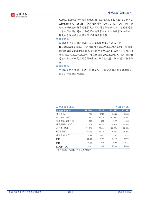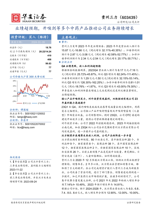 贵州三力2023年业绩超预期,主要得益于核心产品开喉剑系列的强劲需求和对外投资的积极贡献。汉方药业的并表将进一步丰富产品线,增厚未来业绩。华安证券维持“买入”评级,看好公司未来的发展前景。但同时也提示了营销、产品依赖、收购和新公司亏损等风险。