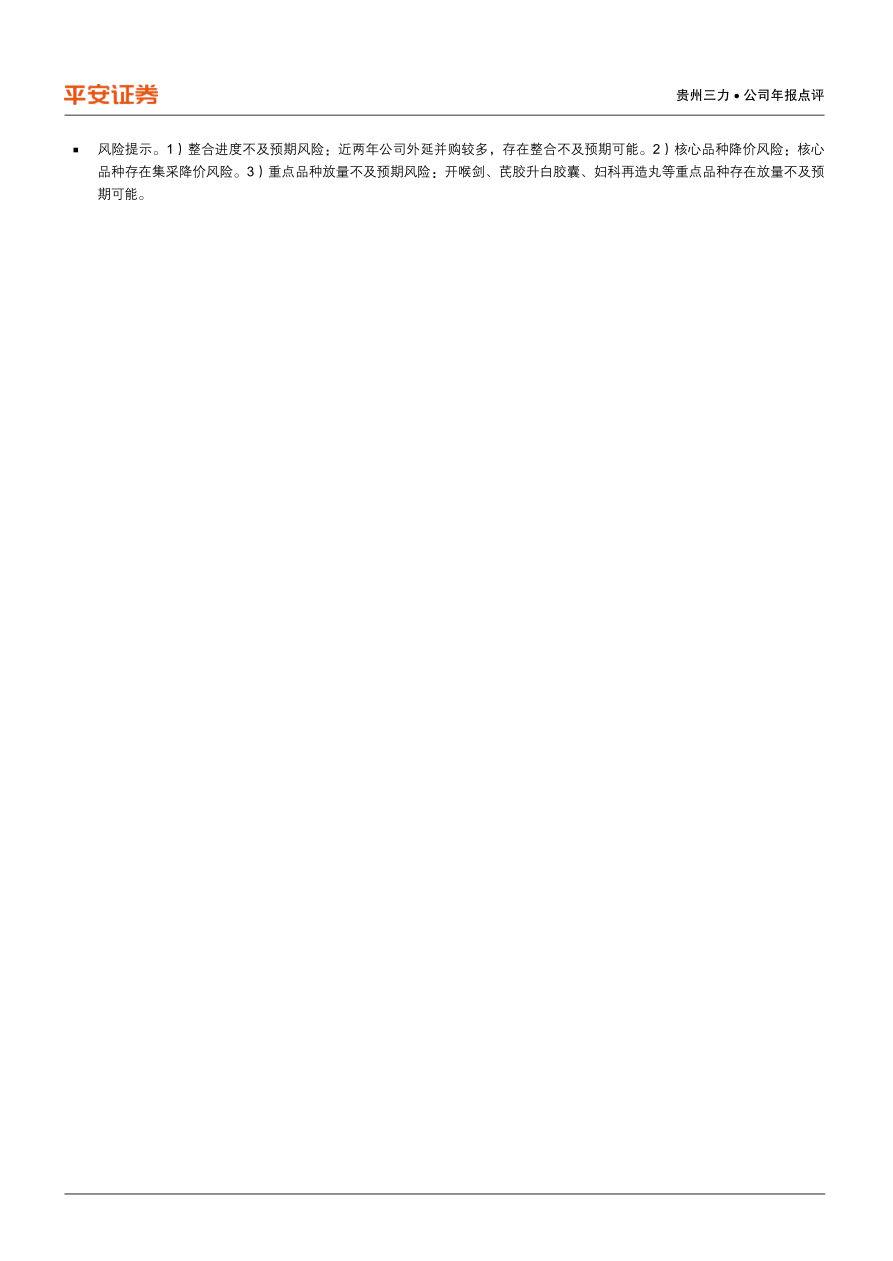 风险提示。1)整合进度不及预期风险:近两年公司外延并购较多,存在整合不及预期可能。2)核心品种降价风险:核心品种存在集采降价风险。3)重点品种放量不及预期风险:开喉剑、芪胶升白胶囊、妇科再造丸等重点品种存在放量不及预期可能。