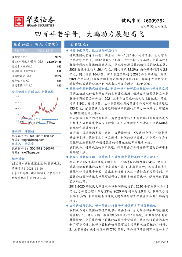 我们预计,公司2021~2023年收入分别32.7/39.7/45.8亿元,分别同比增长33.2%/21.3%/15.4%,归母净利润分别为3.3/4.3/5.4亿元,分别同比增长124.3%/30.4%/24.2%,对应2021~2023年EPS为2.16/2.82/3.50元,对应估值为36X/28X/23X。考虑到公司主业稳定增长、研发产品有梯队,参股公司健民大鹏体外培育牛黄极具稀缺性,首次覆盖,给予“买入”投资评级。