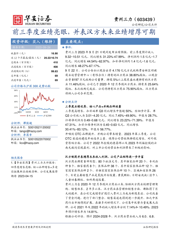 本报告对贵州三力前三季度的业绩进行了分析,并详细阐述了并购汉方药业对公司未来发展的影响。