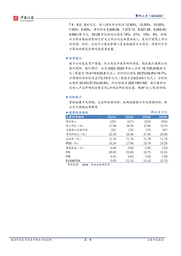 由于公司发生资产重组,汉方药业并表影响利润表,因此我们更新公司盈利预测。我们预计,公司2023~2025年收入分别16.7/25.6/30.6亿元(原值为15.4/19.6/23.8亿元),分别同比增长39.3%/52.8%/19.7%,归母净利润分别为2.7/3.7/4.5亿元(原值为2.6/3.3/4.1亿元),分别同比增长34.3%/37.0%/20.6%,对应估值为26X/19X/16X。我们看好公司核心产品开喉剑后续空间+并购品种后续放量,维持“买入”投资评级。