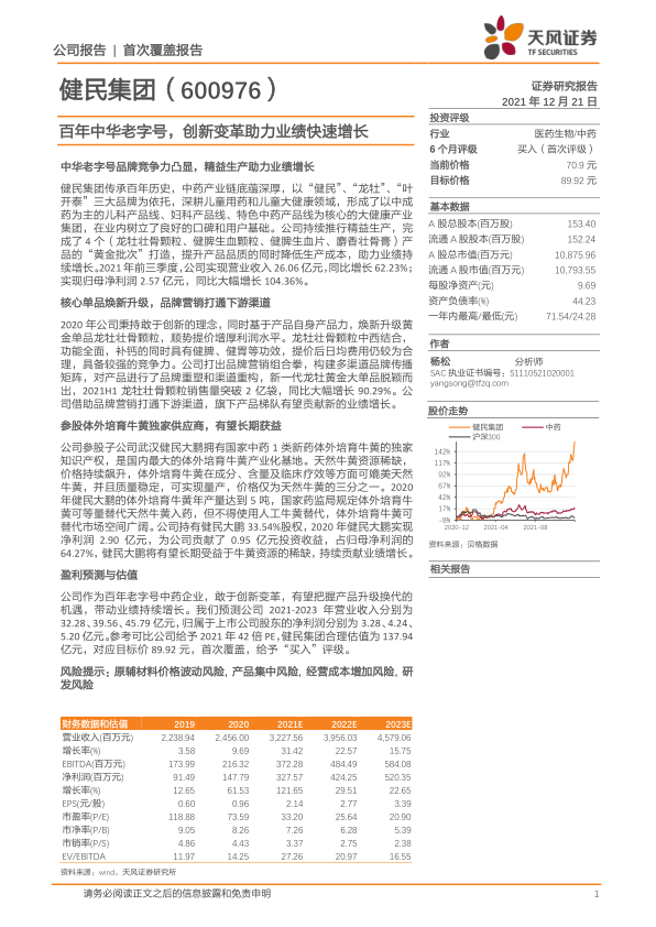 公司作为百年老字号中药企业,敢于创新变革,有望把握产品升级换代的机遇,带动业绩持续增长。我们预测公司2021-2023年营业收入分别为32.28、39.56、45.79亿元,归属于上市公司股东的净利润分别为3.28、4.24、5.20亿元。参考可比公司给予2021年42倍PE,健民集团合理估值为137.94亿元,对应目标价89.92元,首次覆盖,给予“买入”评级。
