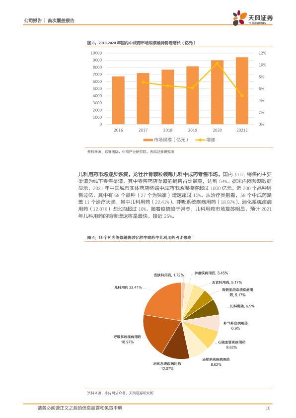 健民集团传承百年历史,中药产业链底蕴深厚,以“健民”、“龙牡”、“叶开泰”三大品牌为依托,深耕儿童用药和儿童大健康领域,形成了以中成药为主的儿科产品线、妇科产品线、特色中药产品线为核心的大健康产业集团,在业内树立了良好的口碑和用户基础。公司持续推行精益生产,完成了4个(龙牡壮骨颗粒、健脾生血颗粒、健脾生血片、麝香壮骨膏)产品的“黄金批次”打造,提升产品品质的同时降低生产成本,助力业绩持续增长。2021年前三季度,公司实现营业收入26.06亿元,同比增长62.23%;实现归母净利润2.57亿元,同比大幅增长104.36%。