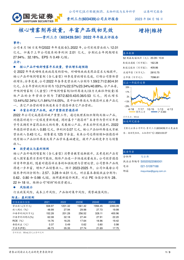 本报告分析指出,贵州三力在2022年凭借核心产品开喉剑喷雾剂的放量以及成功重整德昌祥,实现了营收和利润的双增长。公司通过丰富产品线,提升了整体竞争力。基于对公司未来业绩增长的预期,维持“增持”的投资建议。但同时也提示了行业政策风险、成本上升风险、产品相对集中风险以及商誉减值风险。