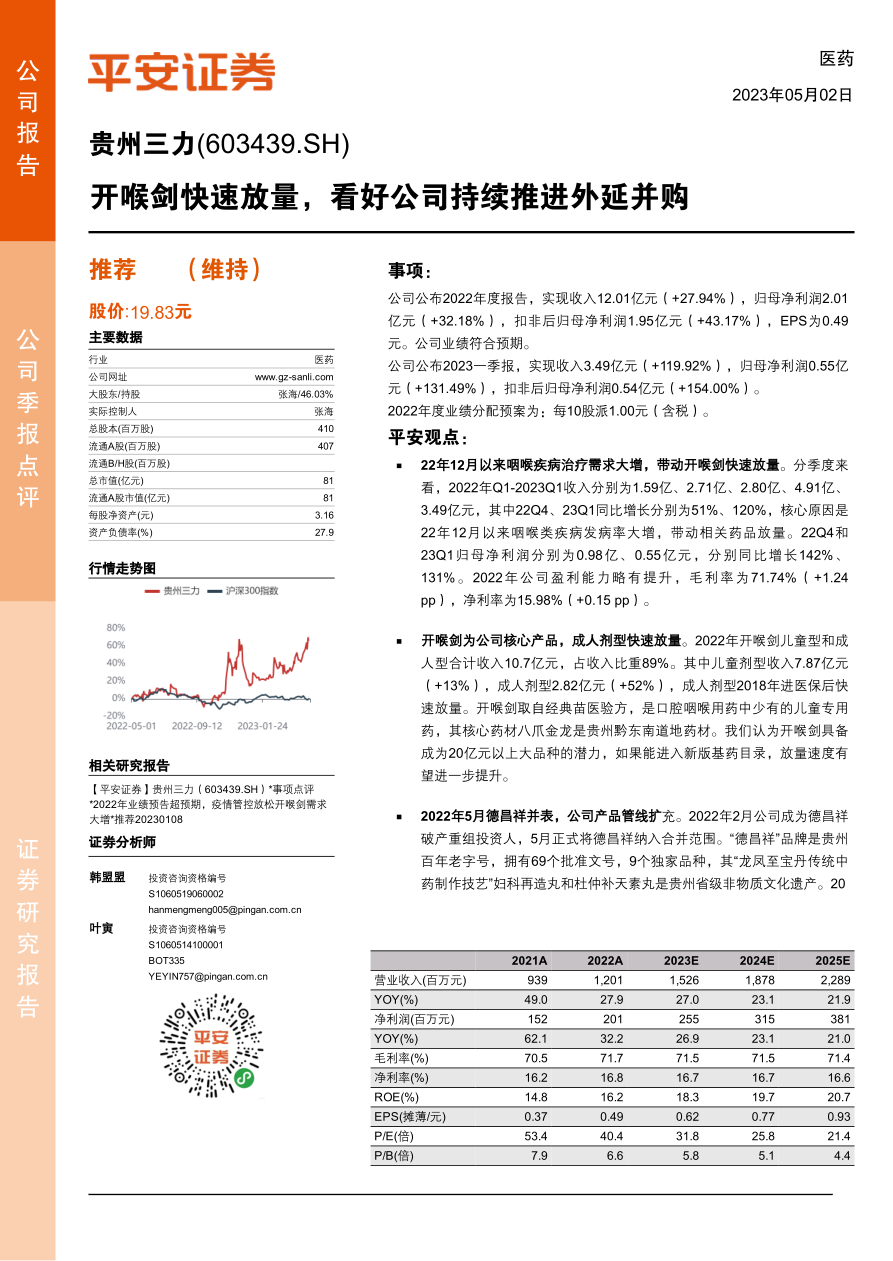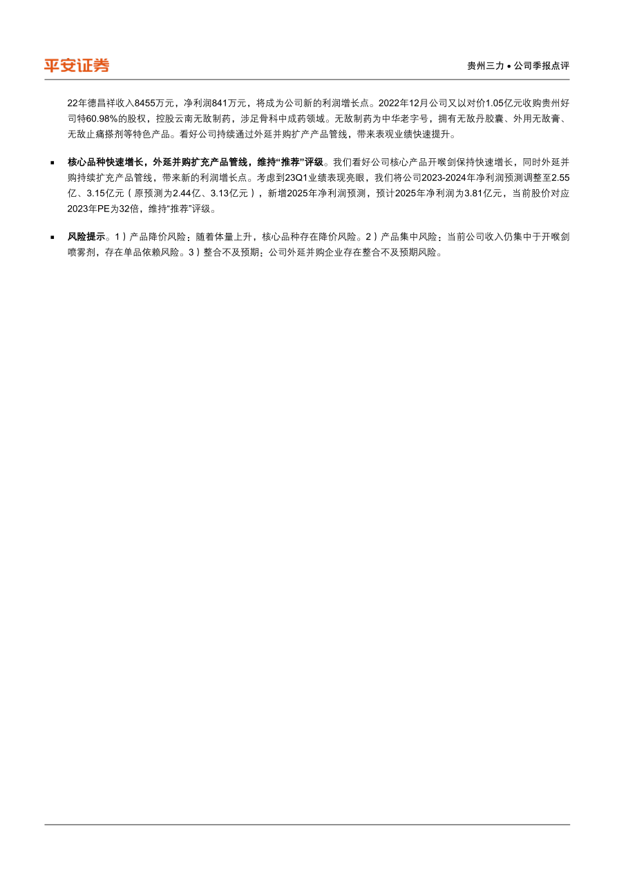 核心品种快速增长,外延并购扩充产品管线,维持“推荐”评级。我们看好公司核心产品开喉剑保持快速增长,同时外延并购持续扩充产品管线,带来新的利润增长点。考虑到23Q1业绩表现亮眼,我们将公司2023-2024年净利润预测调整至2.55亿、3.15亿元(原预测为2.44亿、3.13亿元),新增2025年净利润预测,预计2025年净利润为3.81亿元,当前股价对应2023年PE为32倍,维持“推荐”评级。