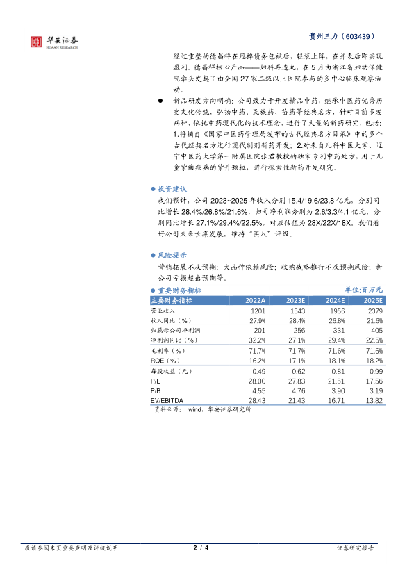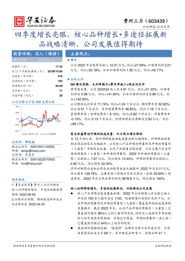 贵州三力2022年业绩表现出色,尤其四季度增长亮眼。核心产品开喉剑系列市场需求旺盛,汉方药业快速增长,渠道覆盖不断加强,德昌祥价值持续挖掘,新品研发方向明确。预计未来几年公司将保持快速增长,维持“买入”评级。但同时也需关注营销拓展、大品种依赖、收购战略和新公司亏损等风险。