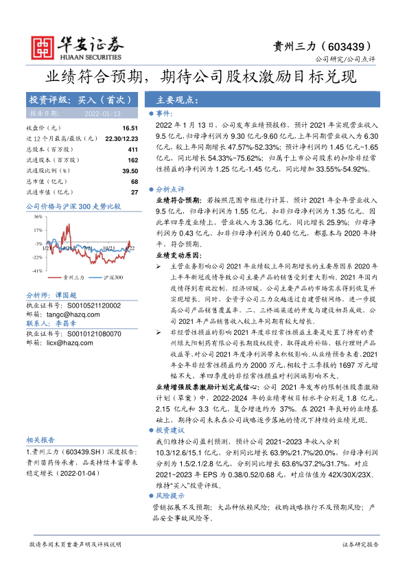 本报告对贵州三力2021年业绩预告进行了详细分析,认为公司业绩符合预期,主要受益于疫情控制后市场需求的恢复和营销网络建设的成效。同时,公司发布的股票激励计划也增强了市场对公司未来业绩增长的信心。维持“买入”投资评级,但同时也提示了营销拓展、大品种依赖、收购战略和产品安全等方面的风险。