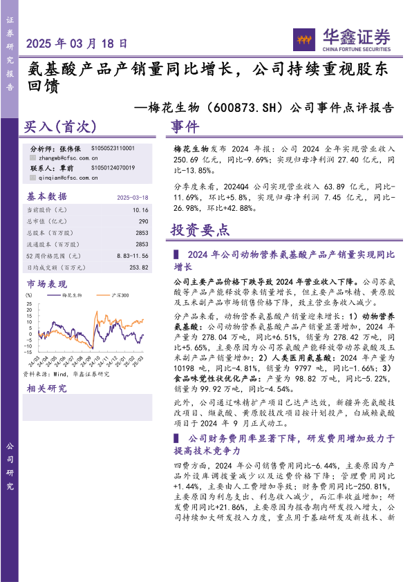 梅花生物在2024年面临主要产品价格下跌带来的营收和净利润压力,但其动物营养氨基酸产品线展现出强劲的增长势头,得益于苏氨酸等关键产品的产能释放。公司在财务管理方面表现出色,财务费用率显著下降,同时持续加大研发投入以提升核心竞争力。此外,公司通过高比例现金分红积极回馈股东,提升了投资吸引力。展望未来,随着新产能的逐步投产和释放,梅花生物的业绩有望实现稳健增长,尽管需关注市场需求、产品价格和原材料成本波动等风险,但其在产能扩张、技术创新和股东回报方面的策略,共同支撑了其长期投资价值。