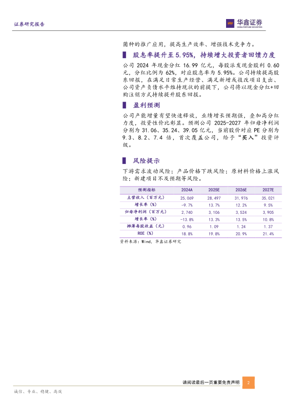 公司产能增量有望快速释放,业绩增长预期强,叠加高分红力度,投资性价比彰显。预测公司2025-2027年归母净利润分别为31.06、35.24、39.05亿元,当前股价对应PE分别为9.3、8.2、7.4倍,首次覆盖公司,给予“买入”投资评级。