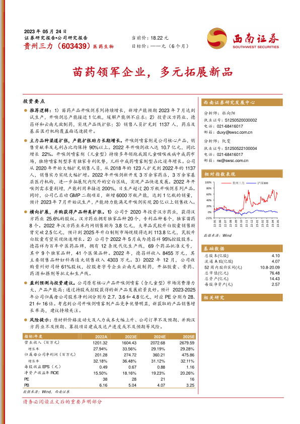 盈利预测与投资建议。公司原有核心产品开喉剑喷雾(含儿童型)市场消费潜力大,产品产能高;通过持股或控股获得的新产品发展前景良好。预计2023-2025年公司归属母公司股东净利润分别为2.7、3.6和4.8亿元,对应PE分别为28、21和16倍。考虑到公司开喉剑喷雾剂产品竞争优势明显,新获取的产品销售增长率高,建议持续关注。
