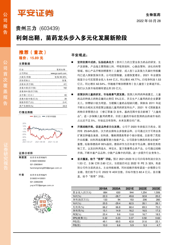 坚持发展中成药,弘扬经典名方:贵州三力的主营业务为药品的研发、生产及销售,产品线主要围绕儿科、呼吸系统科、心脑血管科、消化内科等领域,核心产品开喉剑喷雾剂(儿童型、成人型)以及强力天麻杜仲胶囊均已进入国家医保目录。公司经营稳健,业绩恢复增长,2021年业绩快报显示公司实现营业收入9.44亿元,同比增长49.77%,归母净利润1.53亿元,同比增长62.54%。伴随着开喉剑喷雾剂(含儿童型)全渠道开拓,我们认为其市场规模有望达到20亿元。