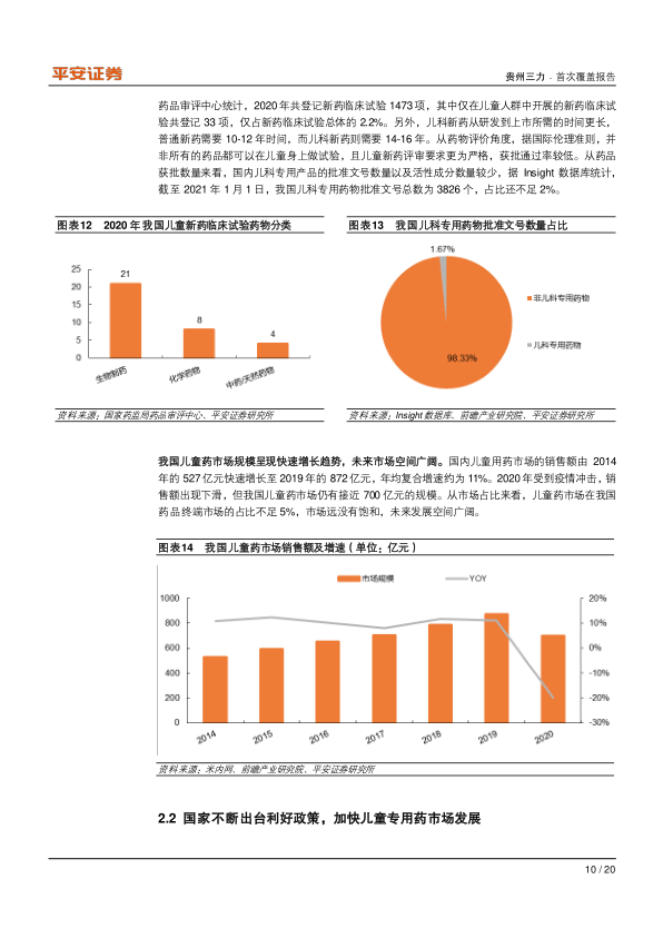 中国儿科用药市场发展起步较晚,存在显著的供需缺口。据统计,我国儿童药品种类仅占药物总量的约5%,且90%以上的儿童用药为非儿童专用药。从剂型来看,儿童专用剂型种类少且地位较低,散剂和颗粒剂是主流。生产儿童用药的企业数量稀少,全国6000多家药厂中,专门生产儿童用药的仅10余家,总数不超过30余家。儿童用药的研发难度大、开发周期长、药物评价难度高,2020年仅有2.2%的新药临床试验针对儿童人群。儿科新药从研发到上市所需时间更长,且评审要求严格,获批通过率较低。截至2021年1月1日,我国儿科专用药物批准文号总数仅为3826个,占比不足2%。尽管存在供给不足,我国儿童药市场规模呈现快速增长趋势,销售额从2014年的527亿元增长至2019年的872亿元,年均复合增速约为11%。2020年虽受疫情冲击有所下滑,但市场规模仍接近700亿元。目前儿童药市场在我国药品终端市场的占比不足5%,市场远未饱和,未来发展空间广阔。