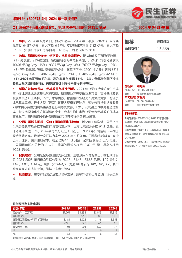本报告分析了梅花生物2024年一季报,指出公司一季度归母净利润同比略有下降,主要受味精、缬氨酸等产品价格下滑影响。但同时,苏氨酸、赖氨酸等产品价格有所提升,且公司新增产能持续投放,氨基酸行业景气度逐步回暖,长期来看利好公司发展。