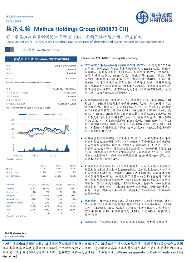 本报告对梅花生物2024年前三季度的业绩进行了分析,指出业绩下滑的主要原因是产品价格下降,但苏氨酸和赖氨酸价格上涨及价差扩大为公司未来业绩带来积极因素。公司持续进行股份回购,并在合成生物技术领域保持领先地位。尽管下调了盈利预测,但考虑到公司的成本优势和发展潜力,维持“优于大市”评级。同时,报告也对公司的ESG表现进行了简要评述。