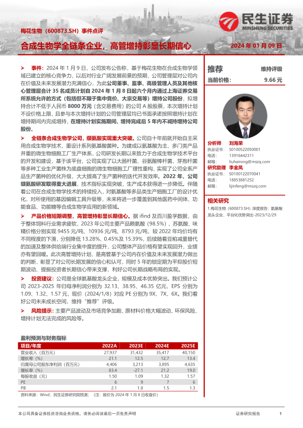 事件:2024年1月9日,公司发布公告称,基于梅花生物在合成生物学领域已建立的核心竞争力,以后对行业广阔发展前景的预期,公司管理层对公司内在价值及未来发展潜力充满信心,为此公司董事、监事、高级管理人员及其他核心管理层合计35名成员计划自2024年1月8日起六个月内通过上海证券交易所系统允许的方式(包括但不限于集中竞价、大宗交易等)增持公司股份,拟增持合计不低于人民币8000万元(含交易费用)的公司A股股票,本次增持计划不设价格上限,且参与本次增持计划的公司管理层均已书面承诺按照增持计划在增持期间内完成增持,在增持计划实施期间、增持完成后5年内不减持增持公司股份。