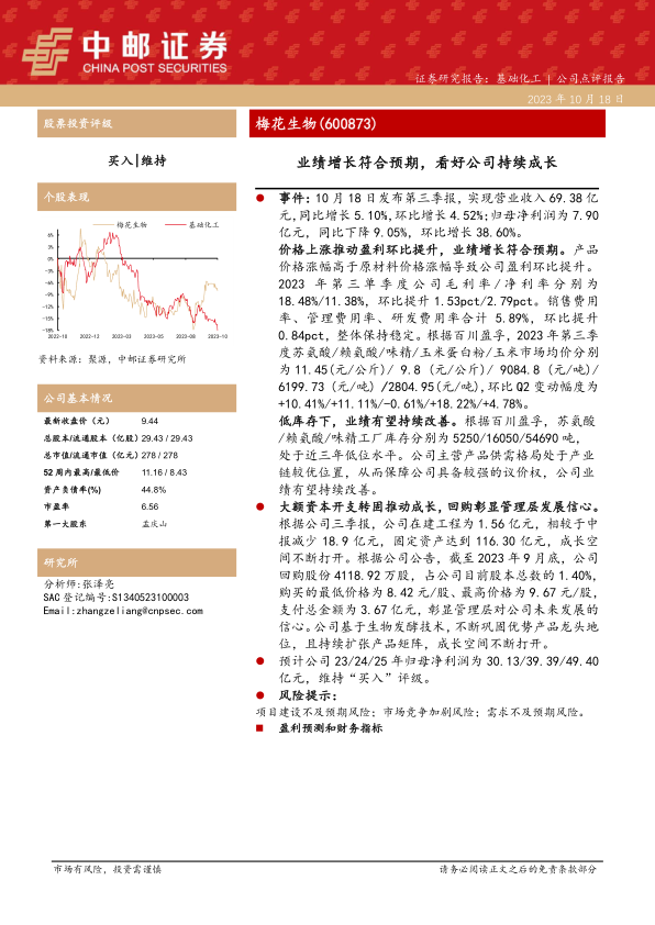 本报告对梅花生物2023年第三季度的业绩进行了分析,认为公司业绩增长符合预期,盈利能力有所提升。同时,报告强调了公司在低库存下的业绩改善潜力,以及大额资本开支转固带来的成长空间。管理层回购股份也显示了对公司未来发展的信心。维持对公司“买入”评级,并预测了未来三年的归母净利润。但同时也提示了项目建设、市场竞争和需求不及预期的风险。