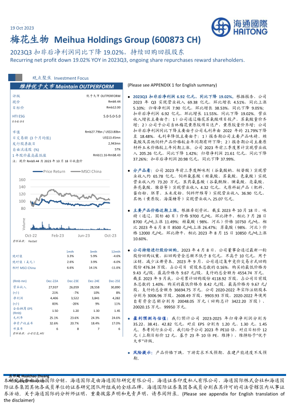 本报告分析了梅花生物(600873 CH)2023年第三季度的业绩表现,并对其未来盈利能力进行了预测。核心观点如下:
