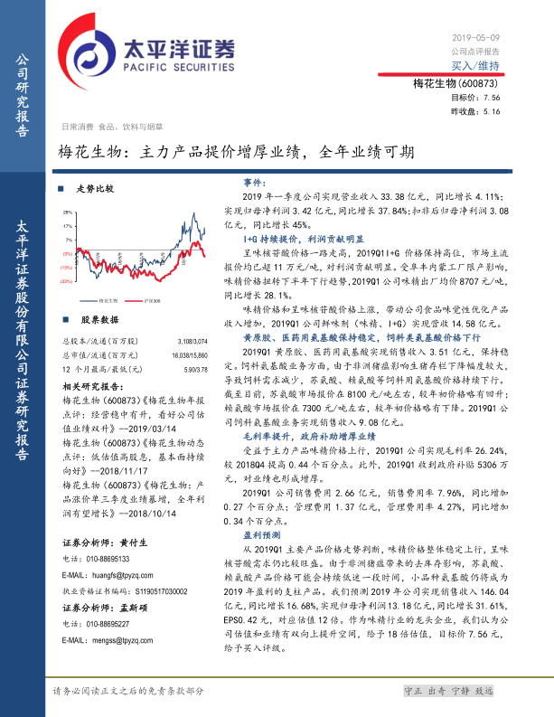本报告分析了梅花生物2019年一季度业绩,指出I+G和味精提价是业绩增长的主要驱动力。同时,报告分析了其他产品线的表现,并对公司未来盈利进行了预测,维持买入评级。报告也提示了行业竞争、疫情和宏观经济波动等风险。