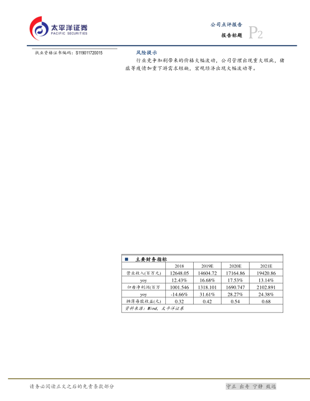 行业竞争加剧带来的价格大幅波动,公司管理出现重大瑕疵,猪瘟等疫情加重下游需求短缺,宏观经济出现大幅波动等。