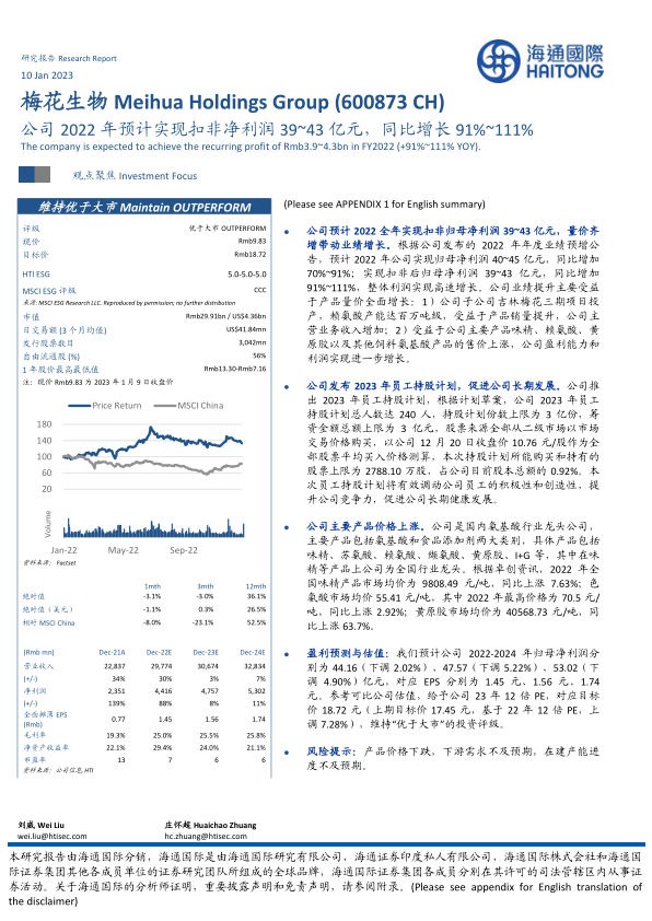 根据公司发布的2022年年度业绩预增公告,梅花生物预计2022年实现归母净利润40-45亿元,同比增长70%-91%;实现扣非后归母净利润39-43亿元,同比大幅增长91%-111%。公司业绩的显著提升主要得益于产品“量价齐升”的双重驱动。