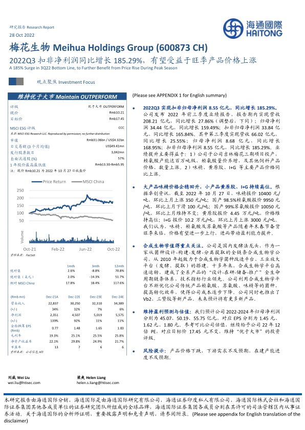 本报告分析了梅花生物2022年第三季度的业绩表现,指出公司业绩增长主要受益于赖氨酸等产品量价齐升以及主要产品价格上涨。同时,报告强调了公司在合成生物学领域的优势和潜力,并维持了公司“优于大市”的投资评级。投资者应关注产品价格波动、下游需求变化以及在建产能进度等风险因素。