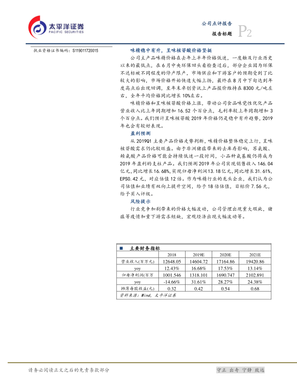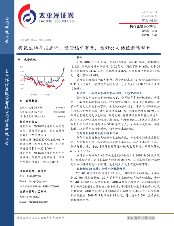 梅花生物2018年经营业绩呈现稳中有升的态势,营业收入实现13.62%的增长,达到126.48亿元。尽管归母净利润受高基数和政府补贴减少影响同比下降14.66%,但扣除非经常性损益后的净利润仍增长7.09%,显示出核心业务的韧性。公司通过成功培育黄原胶和小品种氨基酸等高增长产品,有效优化了产品结构,对冲了味精价格波动和饲料用氨基酸市场疲软的负面影响。吉林白城40万吨氨基酸综合项目的投产,将进一步巩固公司在赖氨酸行业的龙头地位并有望降低生产成本。展望2019年,呈味核苷酸的稳定表现和小品种氨基酸的持续贡献将成为主要盈利驱动。太平洋证券基于公司估值和业绩双升的预期,维持“买入”评级,并设定目标价7.56元,建议投资者关注公司在产品多元化和产能扩张方面的战略成效。同时,需警惕行业竞争、疫情及宏观经济波动等潜在风险。