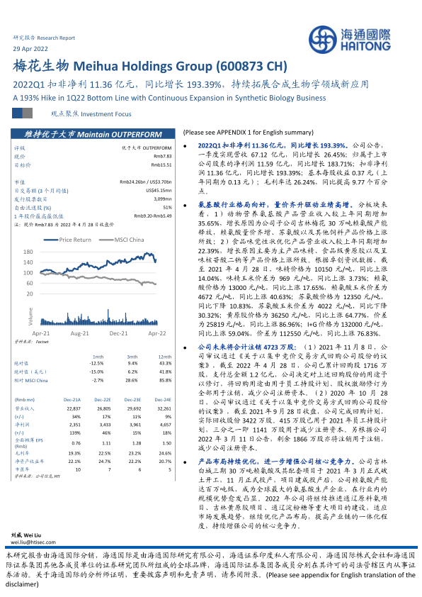 梅花生物在2022年第一季度实现了显著的业绩增长,扣非净利润同比大增193.39%,主要得益于氨基酸行业景气度提升、公司核心产品量价齐升以及新增产能的有效释放。