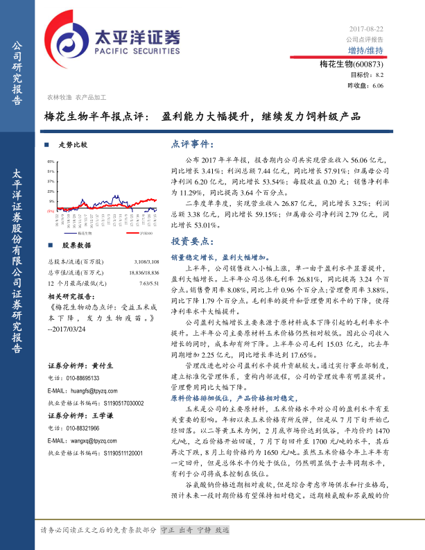 中心思想 盈利能力显著提升: 梅花生物2017年上半年业绩表现亮眼,净利润大幅增长,盈利能力显著提升,主要得益于原材料成本下降和公司管理改进。 维持“增持”评级: 太平洋证券看好梅花生物未来发展,维持“增持”评级,目标价8.2元,主要基于原材料价格保持低位、公司管理效率提升等因素。 主要内容 公司业绩回顾 营收与利润双增长: 2017年上半年,梅花生物实现营业收入56.06亿元,同比增长3.41%;归属母公司净利润6.20亿元,同比增长53.54%。 盈利能力大幅提升: 销售净利率为11.29%,同比提高3.64个百分点,盈利能力显著提升。 盈利能力分析 毛利率提升是关键: 上半年公司总体毛利率 26.81%,同比提高 3.24 个百分点,主要受益于原材料玉米价格下降。 管理费用有效控制: 管理费用率3.88%,同比下降1.79个百分点,通过实行事业部制度和标准化管理体系,公司管理效率明显提升。 原材料价格分析 玉米价格保持低位: 玉米价格虽有小幅回升,但总体仍处于低位,有利于公司控制成本。 产品价格相对稳定: 谷氨酸钠价格近期疲软,但预计未来一段时间有望保持稳定;赖氨酸和苏氨酸价格近期也相对稳定。 产能扩张与项目投资 扩建饲料级氨基酸产能: 公司决定在东北投资25-35亿元,建设40万吨饲料级氨基酸及配套项目,选址白城地区,预计达产后利税可达6亿元左右。 出口形势良好: 上半年公司的黄原胶和动物营养用氨基酸市场需求旺盛,销量和价格同步提升,赖氨酸和苏氨酸出口形势良好,增长较快。 盈利预测与投资评级 盈利预测: 预测公司 2017-18 年营收增速为 6.8%、6.5%,净利润增速为 30.5%、7.2%,对应 EPS 为 0.44、0.48 元。 投资评级: 维持“增持”评级,目标价 8.2 元。 总结 核心观点重申: 梅花生物2017年上半年盈利能力大幅提升,主要受益于原材料成本下降和管理改进。公司积极扩建产能,未来发展可期。 投资建议维持: 太平洋证券维持对梅花生物的“增持”评级,认为公司未来一段时间仍将受益于原材料价格低位和管理效率提升。