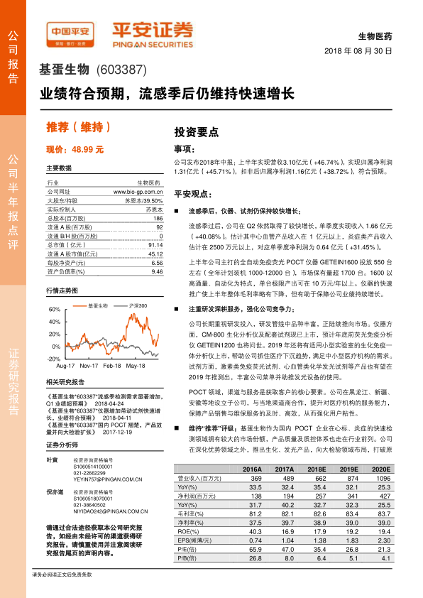 本报告分析了基蛋生物2018年中报,指出公司业绩符合预期,流感季后仪器和试剂仍保持快速增长。报告强调了公司在POCT领域的市场份额和竞争优势,并对其未来发展潜力进行了评估。