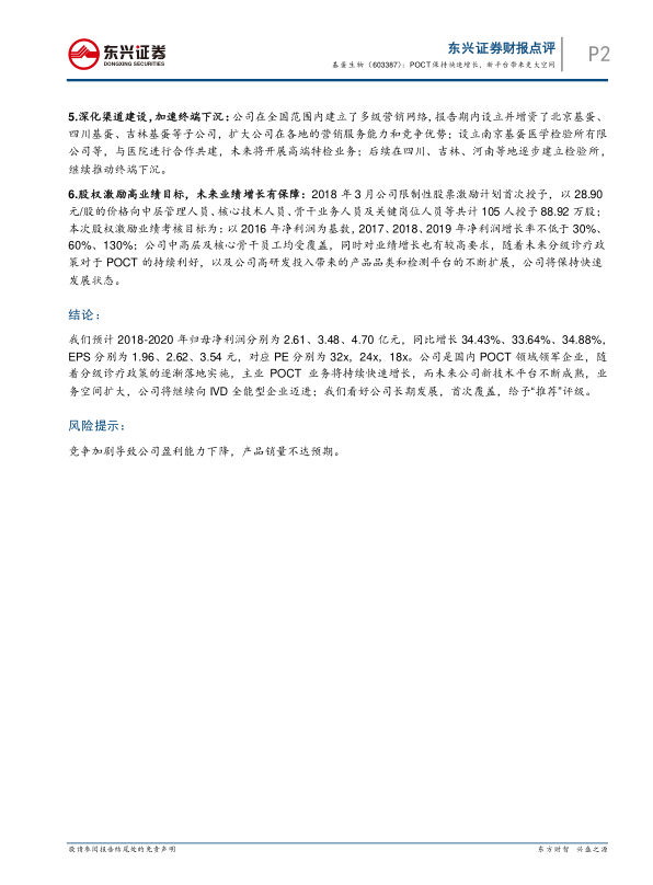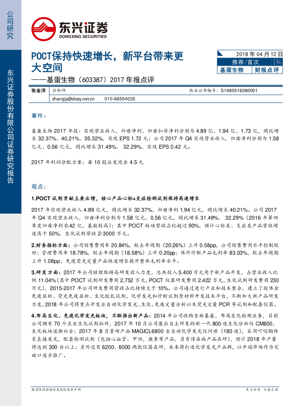 基蛋生物 2017 年业绩表现良好,POCT 业务保持快速增长,财务指标稳健。公司持续投入研发,积极拓展生化、化学发光等新领域,并深化渠道建设,为未来发展奠定基础。