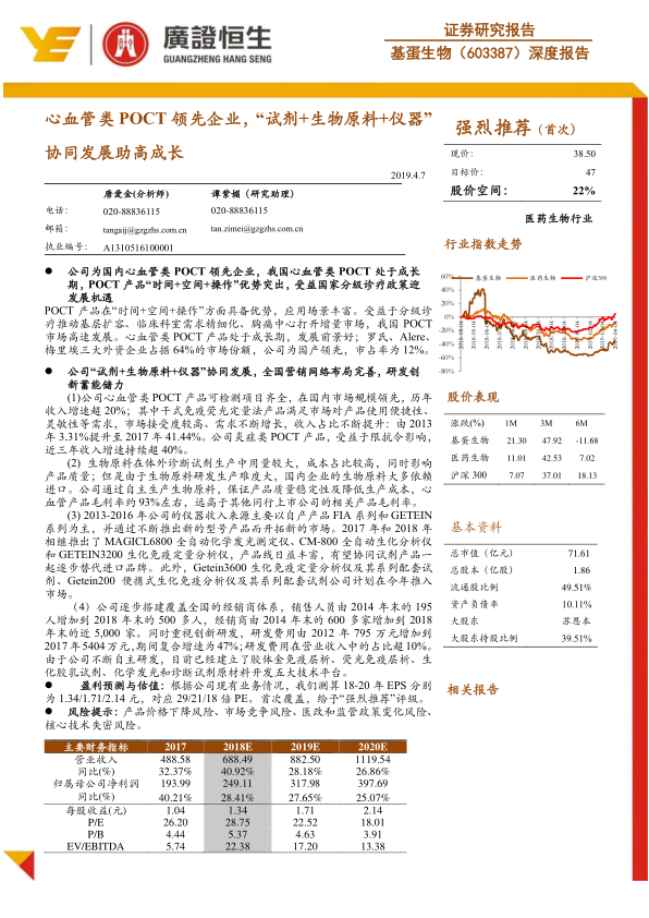 基蛋生物作为国内心血管类POCT领域的领军企业,凭借其在POCT产品“时间+空间+操作”方面的显著优势,以及国家分级诊疗政策带来的市场机遇,展现出强劲的增长潜力。公司通过“试剂+生物原料+仪器”的协同发展战略,实现了心血管类POCT产品在国内市场的领先地位,并保持了超过20%的收入增速。尤其值得关注的是,公司自产生物原料的策略有效降低了成本,使得心血管产品毛利率高达93%左右。同时,公司持续的研发创新投入和完善的全国营销网络布局,为其业绩的持续高增长提供了坚实支撑。尽管面临产品价格下降、市场竞争、政策变化和技术失密等风险,但基于其核心竞争力、市场地位和增长策略,预计公司未来盈利能力将持续提升,因此给予“强烈推荐”评级。