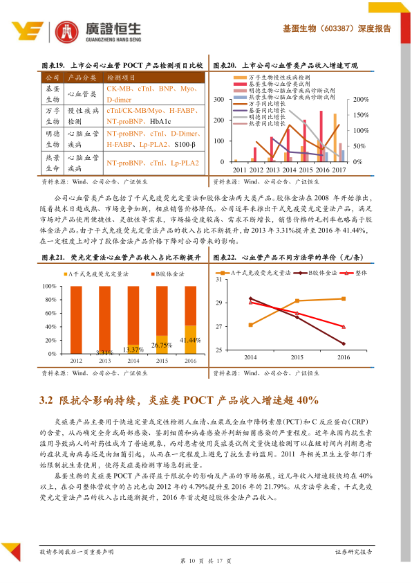 - 受益于2011年起实施的“限抗令”,炎症类检测市场需求急剧放量。基蛋生物的炎症类POCT产品收入增速近几年均超过40%,在公司总营收中的占比从2012年的4.79%提升至2016年的21.79%。