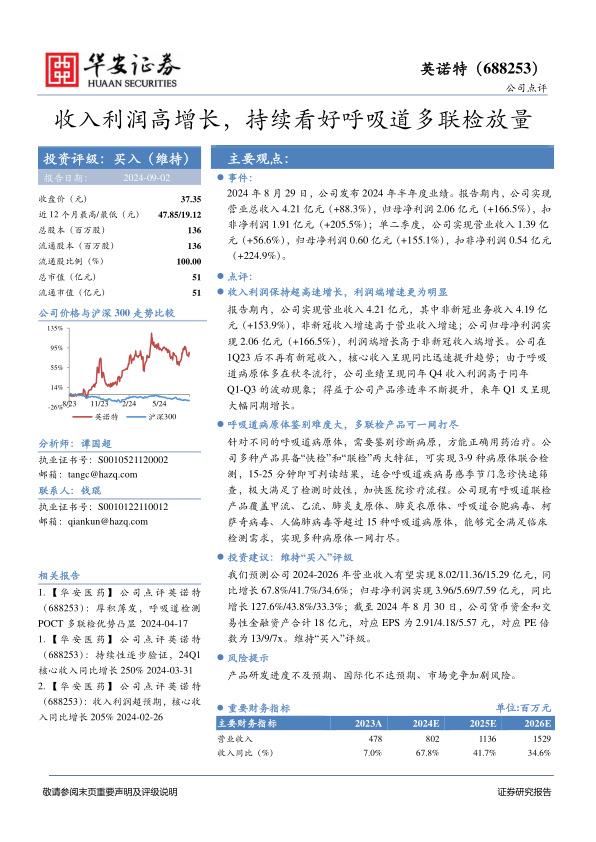 本报告对英诺特2024年半年度业绩进行了全面分析,认为公司在非新冠业务的驱动下,实现了收入和利润的高速增长。公司呼吸道多联检产品凭借其快速、全面的特点,在市场中具有显著优势。维持对公司“买入”评级,并预测未来几年公司将保持良好的增长势头。同时,报告也提示了产品研发、国际化和市场竞争等方面的风险,建议投资者关注。
