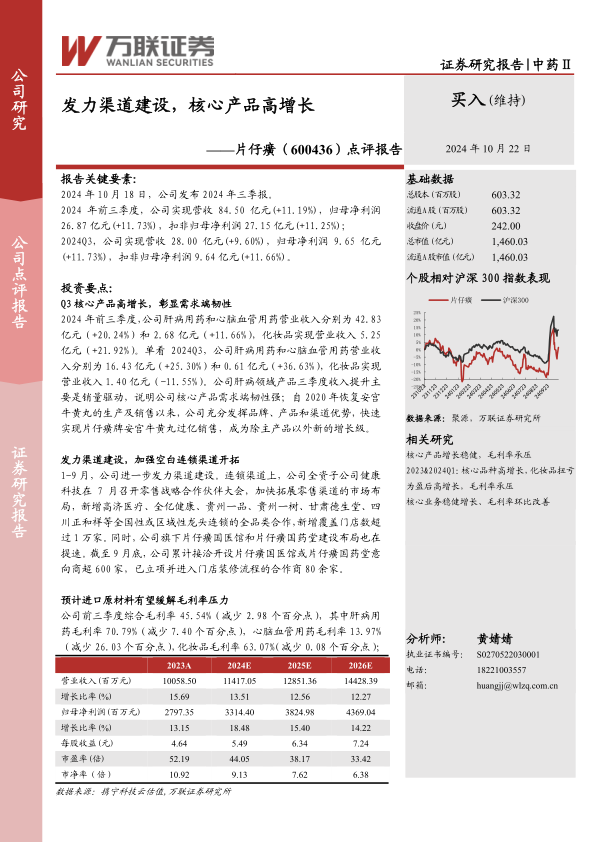 片仔癀公司在2024年前三季度展现出强劲的业绩增长,营收和归母净利润均实现双位数增长,核心产品如肝病用药和安宫牛黄丸表现出显著的市场韧性和增长潜力。公司积极推进渠道建设,通过拓展零售连锁渠道和加速国医馆、国药堂布局,有效扩大了市场覆盖。尽管当前面临稀缺原材料价格上涨导致的毛利率压力,但随着进口牛黄政策的推进,未来原材料供应有望改善,从而缓解成本压力。分析师基于公司核心产品的稀缺性和竞争优势,对未来业绩持乐观预测,并维持“买入”评级,同时提示了原材料供给、研发进展及安宫牛黄丸市场竞争等潜在风险。