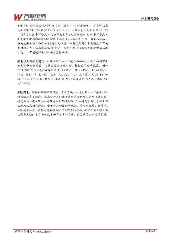 盈利预测与投资建议:公司核心产品片仔癀具备稀缺性,新产品安宫牛黄丸竞争优势明显,化妆品业务表现向好。根据公司公告披露,预计2024/2025/2026年归母净利润33.14亿元、38.25亿元、43.69亿元,对应EPS5.49元/股、6.34元/股、7.24元/股,对应PE为44.05/38.17/33.42(对应2024年10月21日收盘价242元),维持“买入”评级。