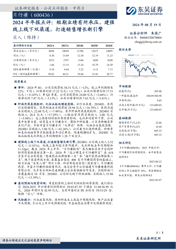 本报告对片仔癀2024年半年度业绩进行了分析,指出公司短期业绩承压,但各业务板块发展良好,线上线下渠道建设稳步推进,长期增长潜力依然存在。虽然下调了盈利预测,但维持“买入”评级,表明对公司未来发展的信心。