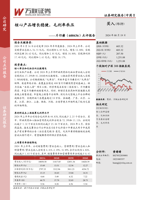 本报告的核心观点是,片仔癀公司在2024年上半年实现了营业收入和净利润的双增长,主要得益于核心产品片仔癀系列和化妆品业务的稳健增长。然而,原材料成本上升导致毛利率承压,公司正积极寻求通过进口牛黄等方式缓解成本压力。同时,公司通过优化渠道布局和控制费用,提升了整体运营效率。